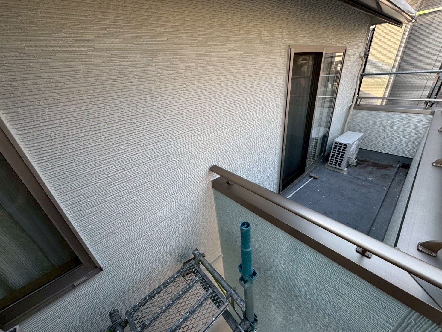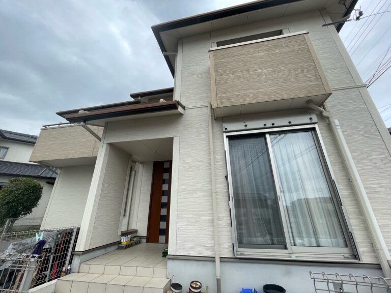 今回の外壁塗装では、建物全体の明るさを引き立てるオフホワイトをベースに、落ち着いた雰囲気を添えるパストグリーンをアクセントとして組み合わせました。